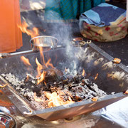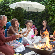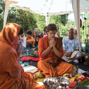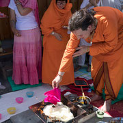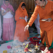 A yagna is an ancient Vedic fire ceremony. The offerings are placed in the fire, which represents the mouth of Narayana. In this type of worship, they go directly to Him. This ceremony for God is often performed as a group. Through this, the worshippers receive the blessings of God, who is awakened in the fire by the prayers recited in Sanskrit. Rice and ghee are usually offered, together with the mantras (prayers). At the end of the yagna, arati is offered to the gods and all the deities who were present during the ceremony and offered help and support are asked to return to heaven.