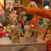 Puja is the simplest form of devotion to God. Whatever is offered to God in the form of the revered murti, He gives back to us as blessed food (prasad). God lives in the murti as the highest form. Everything that is offered to the murti in this type of worship is thus offered to Narayana (God). This awakens love for Him. The offerings (prasad) are presented together with specific prayers (mantras).