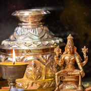 Abhishekam is the sacred bathing ritual in which the five substances (panchamrita) are offered to the respective form of God. These are milk, yogurt, butter (ghee), honey, and sugar. After the image of the god (murti) has been poured over with the five “elements,” it is cleansed with water, dressed, and adorned. The consecrated ingredients can be consumed after the ceremony.
